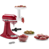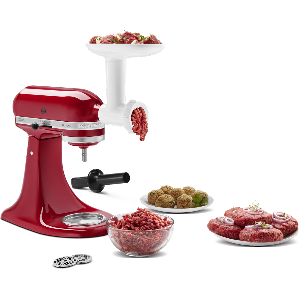 Uvijek popularni dodatak za mljevenje hrane KitchenAid za sve naše kuhinjske robote sada je jači i lakši za uporabu nego ikad. Omogućuje vam brzo usitnjavanje, ribanje i mljevenje svih vrsta različitih sastojaka. Hranjivu i ukusnu hranu poput mesne štruce, falafela, salse i pljeskavica napravite kod kuće! Diskovi za grubo (6 mm) ili fino (4,5 mm) mljevenje od nehrđajućeg čelika možete koristiti za mljevenje, drobljenje ili ribanje svih sastojaka. Osim što ga koristite kao mlin za meso, idealan je i za drobljenje i ribanje suhog kruha, povrća, voća, orašastih plodova i sira. Uz nastavak za mljevenje mesa KitchenAid nalazi se uklonjiva ladica i prikladan potiskivač hrane koji sigurno vode sastojke prema diskovima za mljevenje. Nastavak je pogodan za pranje u perilici posuđa. Zašto ne biste postali kreativni i upotrijebili ovaj nastavak za mljevenje zajedno s našim KitchenAid priborom za cjeđenje voća i povrća ili nastavkom za punjenje kobasice za izradu kobasica, umaka i džemova?