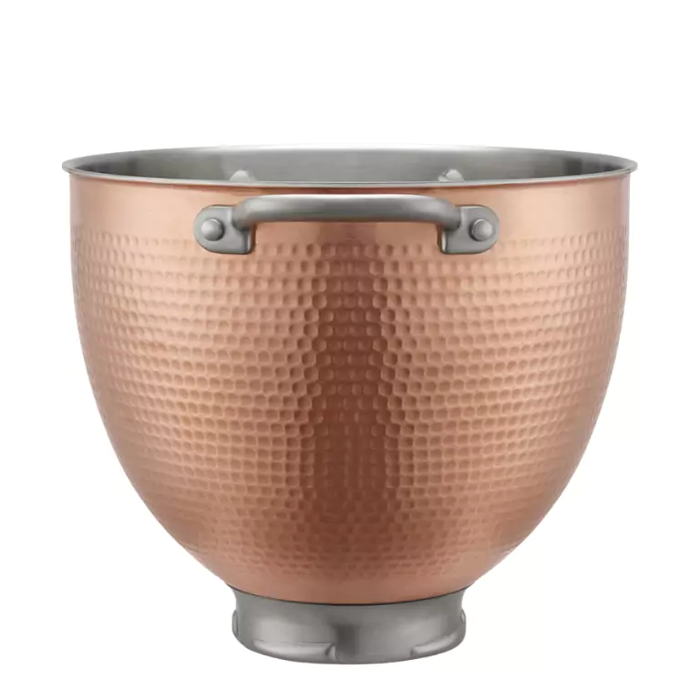 Ova bakrena zdjela reljefnog uzorka zapremnine 4,7 l s unutrašnjošću od nehrđajućeg čelika i ručkama u stilu lonca daje vašem mikseru potpuno novi, luksuzan izgled.