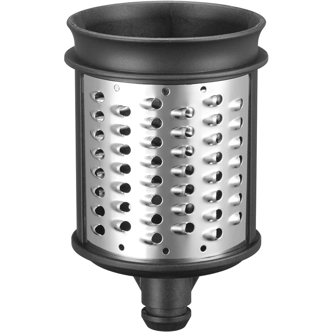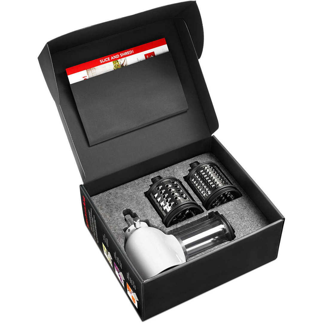 Olakšajte si brzu pripremu svježe hrane s ovim nastavkom za samostojeći mikser. Posegnite za njim, sljedeći put kad ćete imati osnovne zadatke rezanja i usitnjavanja. Napravite rižu od cvjetače, krastavce za salatu, mrkvu za kuhanje ili salatu, sir za tacos, kupus, krumpir za hash browns, tikvicu i još mnogo toga. Čvrst i svestran, nastavak se može pričvrstiti na centralni otvor na samostojeći mikser i spremni ste krenuti! Sadrži tri oštrice koje se jednostavno postavljaju jednim klikom u kućište. Odaberite željenu oštricu za rezanje ili za srednje i grubo usitnjavanje. Čišćenje je prikladno jer oštrice i potiskivač hrane možete staviti u perilicu posuđa. Samo tijelo (kućište) nije moguće prati u perilici posuđa, pa ga operite ručno.