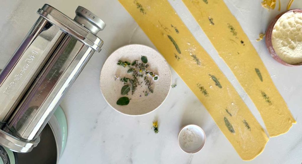 Sada možete poslagati začinsko bilje i jestivo cvijeće, samo pazite da ga slažete više prema sredini, da vam uz rub ostane prazno. Vodom premažite rub tijesta pa stavite na njega drugu polovicu i zalijepite preko polovice s cvijećem. Prerežite rub da vam bude ravan pa opet provucite tijesto kroz razinu 4 pa postepeno povećajte do razine 6 ili 7.