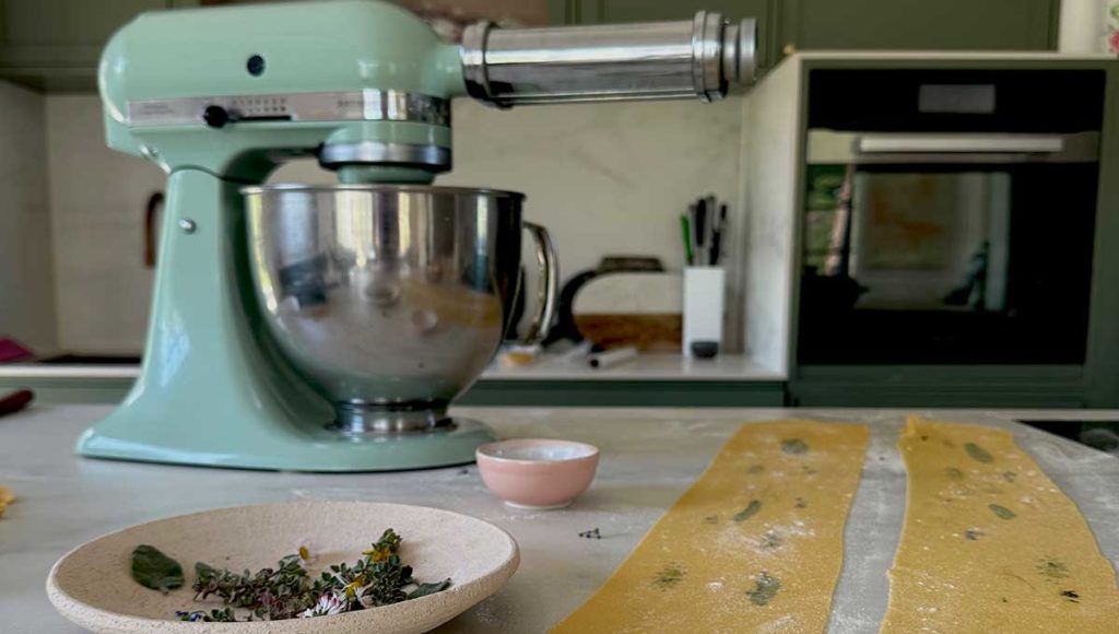Sada možete poslagati začinsko bilje i jestivo cvijeće, samo pazite da ga slažete više prema sredini, da vam uz rub ostane prazno. Vodom premažite rub tijesta pa stavite na njega drugu polovicu i zalijepite preko polovice s cvijećem. Prerežite rub da vam bude ravan pa opet provucite tijesto kroz razinu 4 pa postepeno povećajte do razine 6 ili 7.